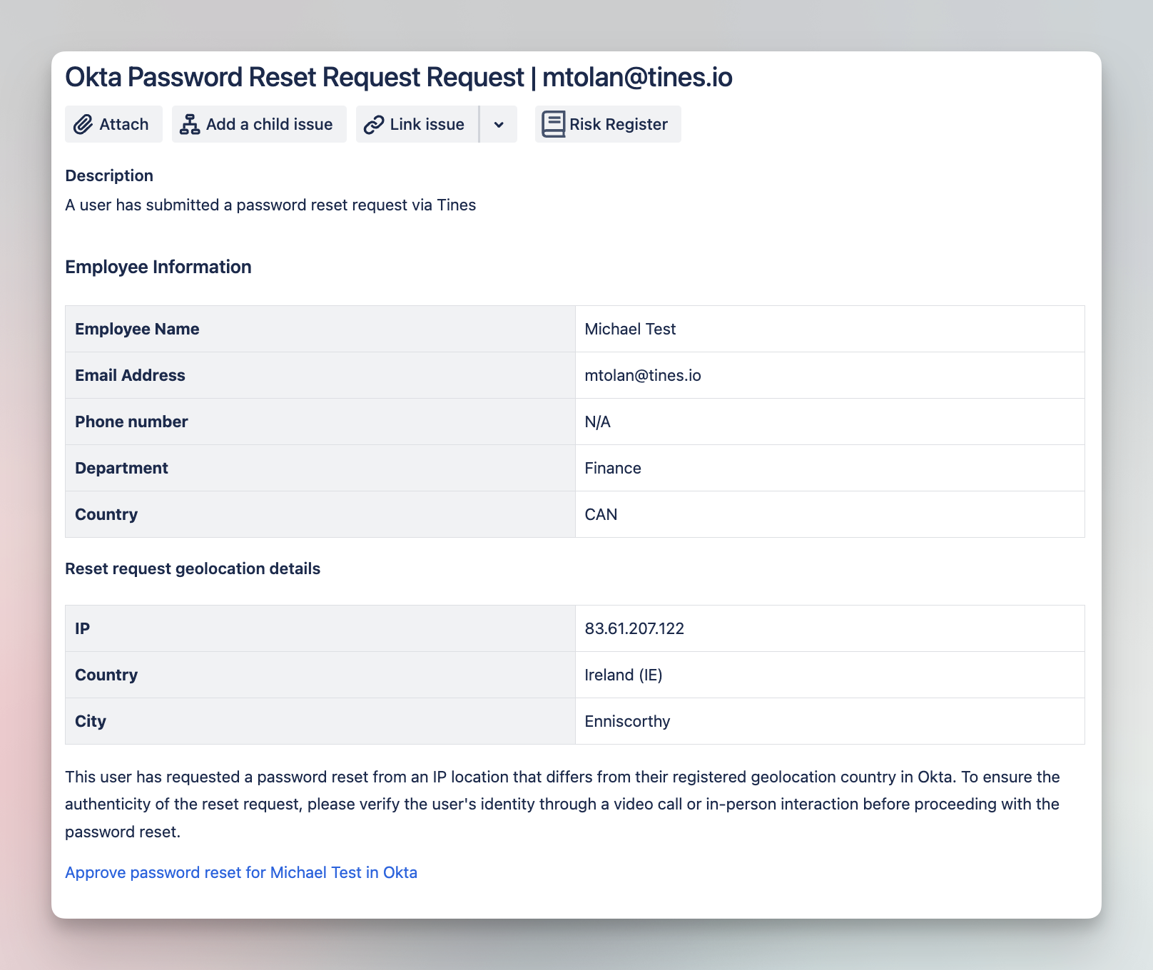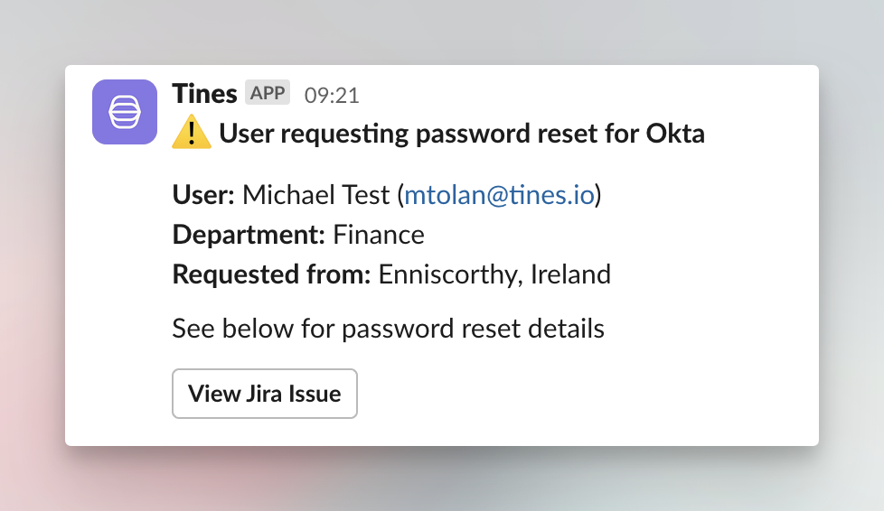 Enable users to initiate password resets via Tines Pages. Leverage IP geolocation for additional security by validating user requests. Track all activities in a Jira ticket for audit compliance.