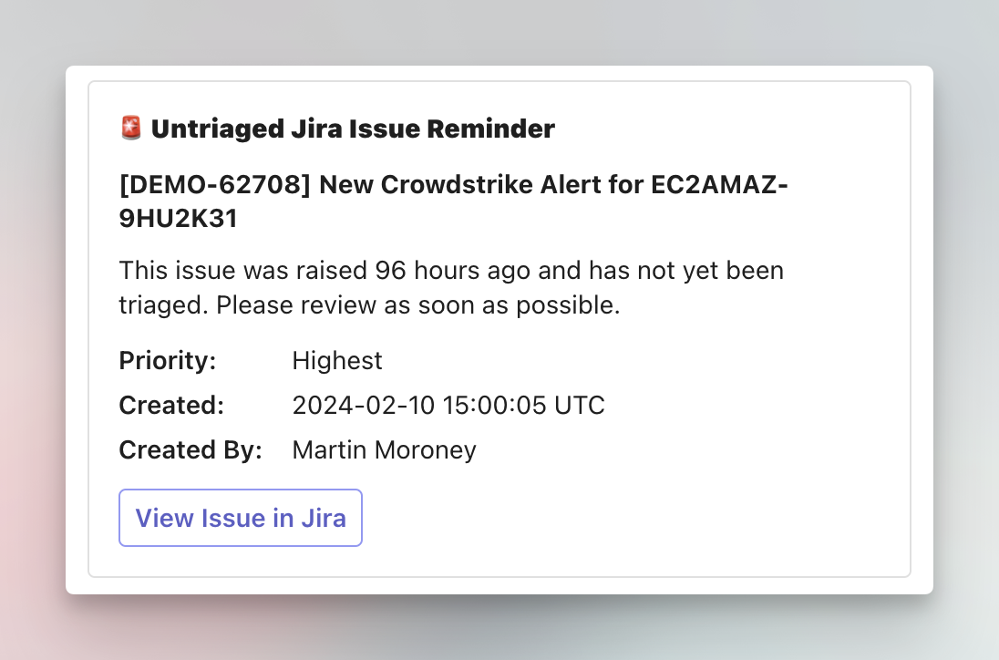 Routinely scan for issues that have not been triaged in a Jira project. Notify a channel via Microsoft Teams when an issue with high priority is detected.