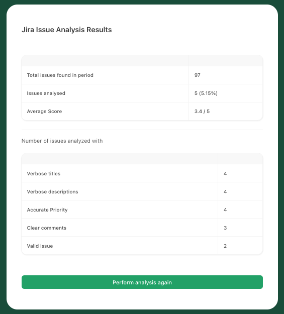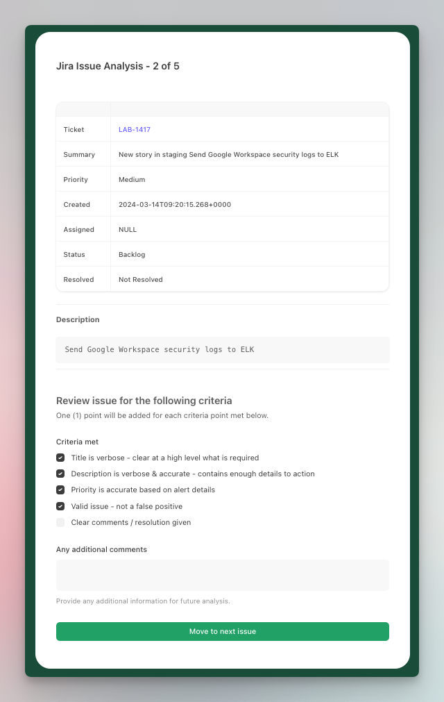 Analyze issues in your Jira domain for quality to help determine the value of alerts that are raised to your SOC team. Sample a number of issues in a given period from and score them if they meet specified criteria. Record all of the results using Tines Records and display the results at the end.