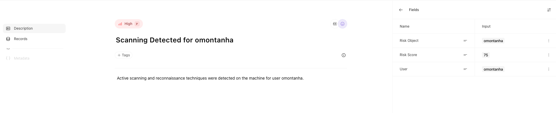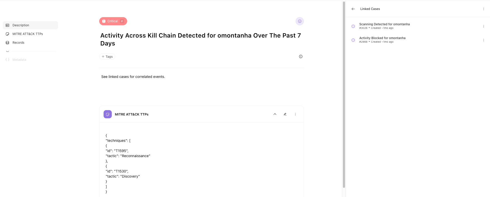 With the help of AI, this story groups cases by risk object and triggers new cases to gain insight into particularly high-risk scores or activity that spans the MITRE ATT&CK framework.