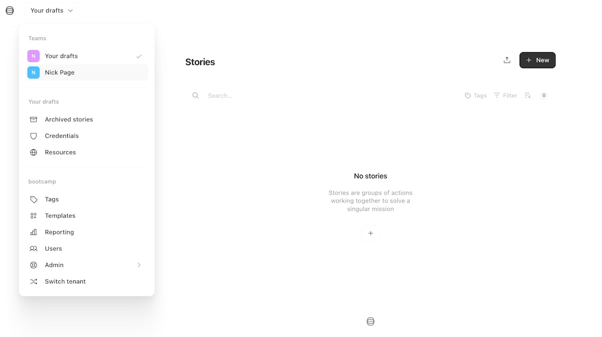 Right now, you are in your own team called "Personal". This is a great spot for testing workflows and building before your stories are ready for production. However, we have already built a Team for you today where you can build.