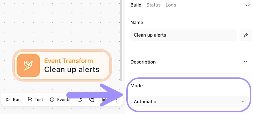 Automatic mode is one of several modes available in the Event Transform action. It's designed to make complex data transformations accessible to everyone, regardless of coding experience. It is also one of our AI features that does not consume AI credits.