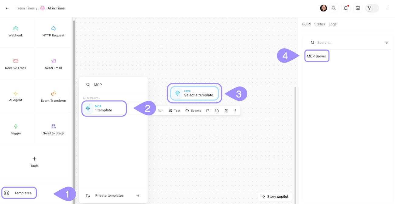 Creating an MCP server in Tines is straightforward. You'll use a template action that handles all the protocol details, so you can focus on configuring which tools to expose.