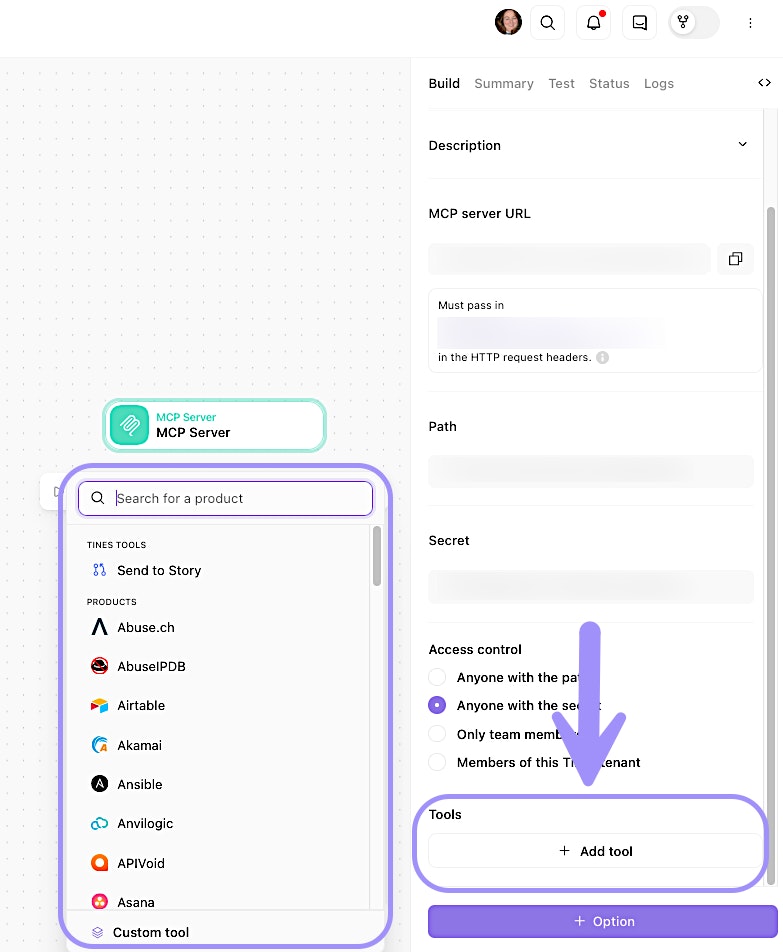 Custom tools: These are action groups you can build specifically for your MCP server. They're useful when you want to create a tool that doesn't correspond to a full story, or when you want to bundle several actions together into a single tool.