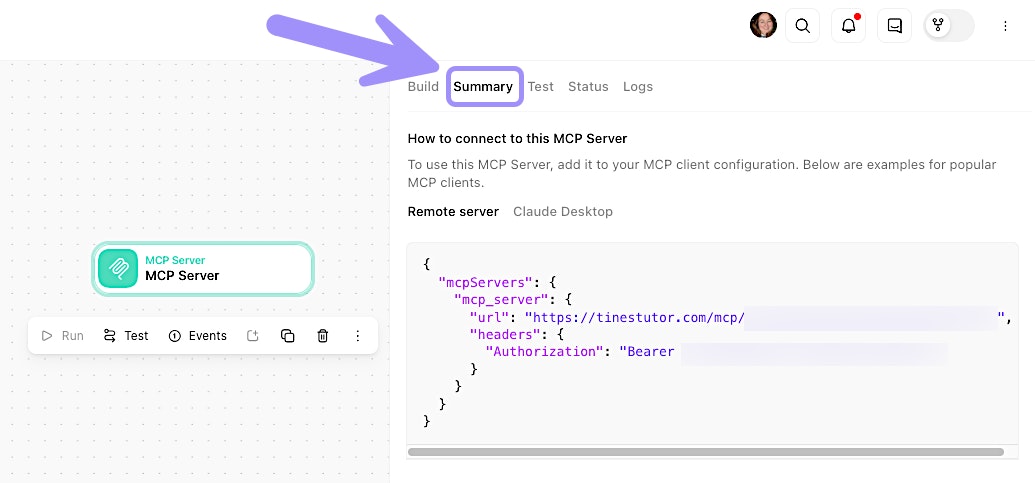 In the Summary tab of your MCP server action, you'll find configuration examples for popular MCP clients. These snippets include your server URL and authentication setup, so you can copy and paste them directly into your client's settings.