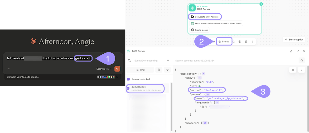 Events example of an MCP server in Tines interacting with Claude Desktop via the tools/call method.