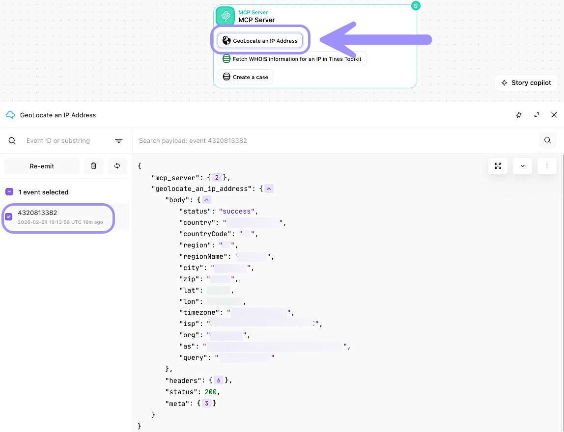 Every time an MCP client interacts with your server, Tines creates events that you can use for monitoring, debugging, or triggering other workflows.