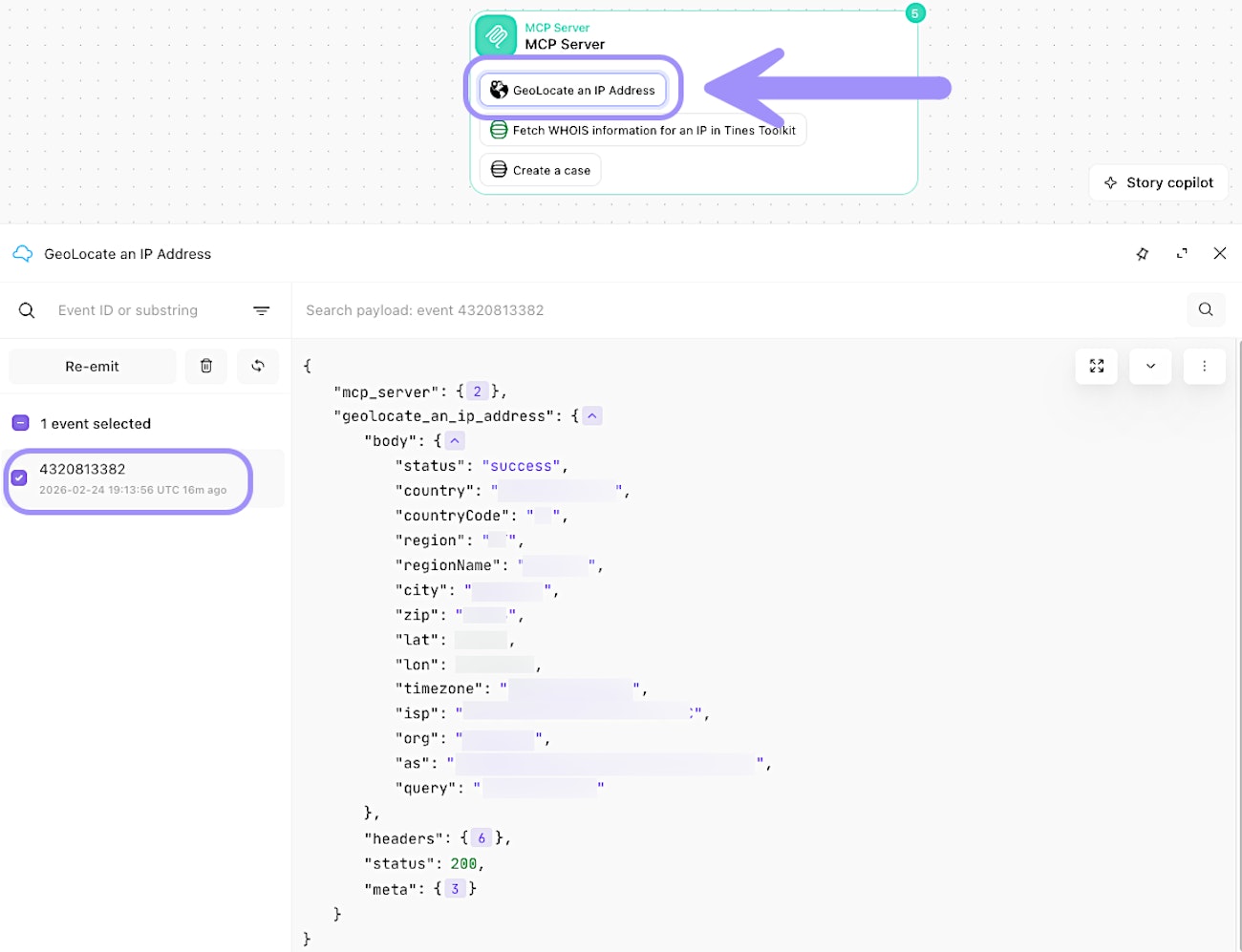 Every time an MCP client interacts with your server, Tines creates events that you can use for monitoring, debugging, or triggering other workflows.