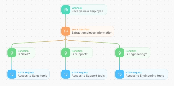 See how the story utilizes conditions to categorize the employee's department and handle the event flow depending on the value?