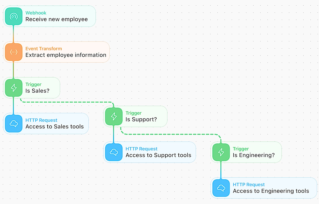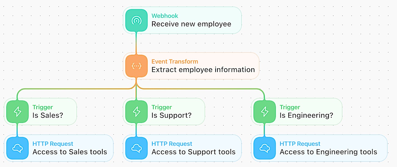 A story fork with parallel triggers is ideal for scenarios where the data passing through is being categorized. For example, let's take a look at the employee onboarding story that utilizes parallel triggers:
