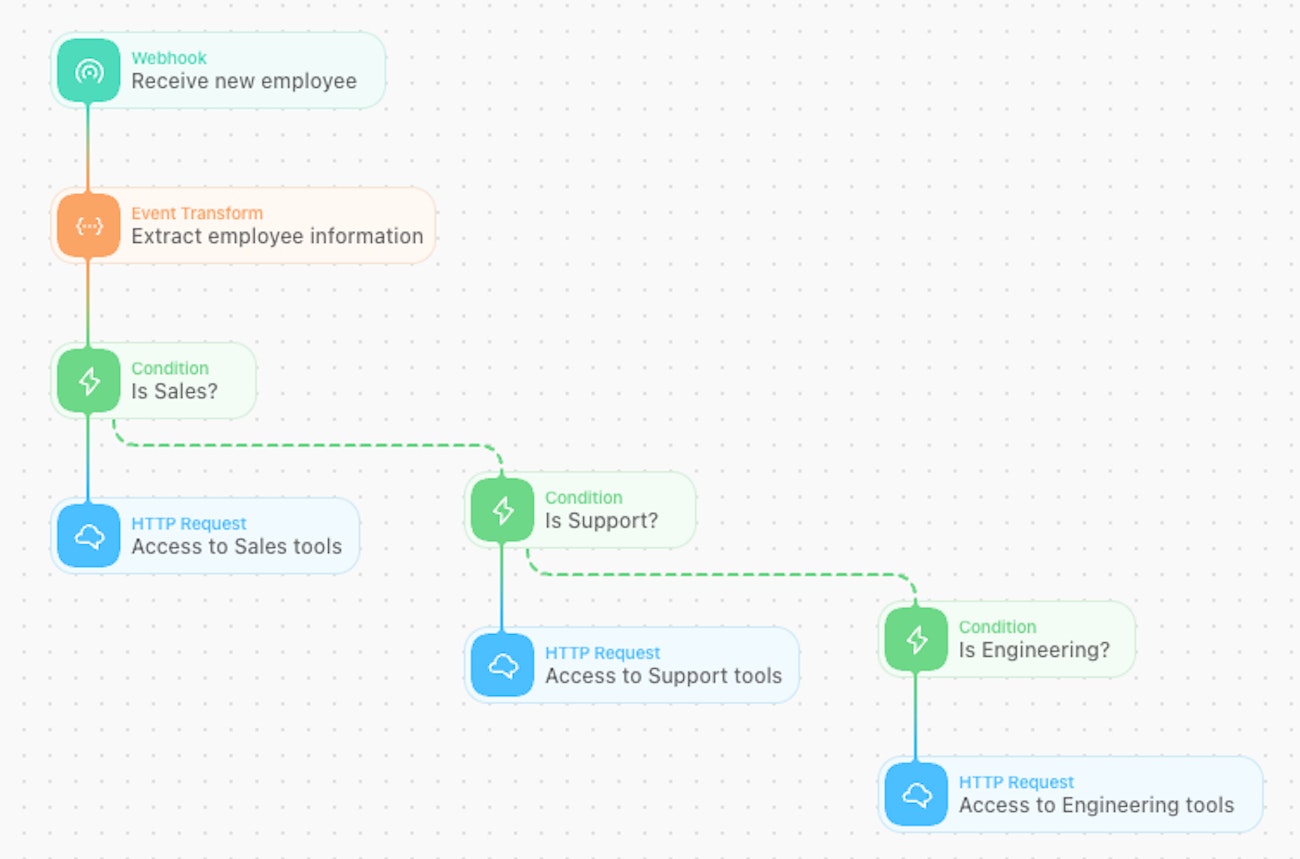 See how the story utilizes conditions to categorize the employee's department and handle the event flow depending on the value?