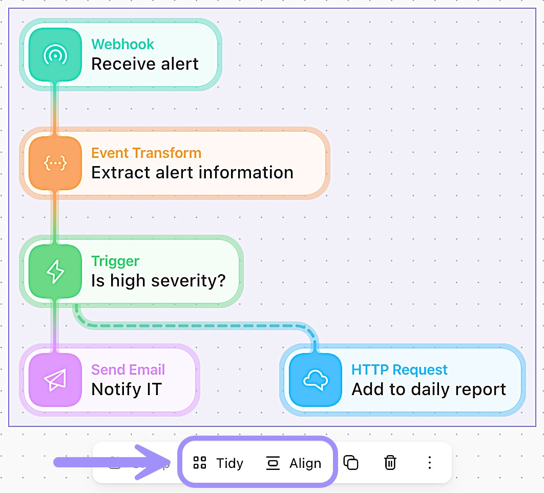 Both the Tidy and Align options help organize the location of your actions on the storyboard for better readability. To utilize Tidy/Align, click CTRL or CMD + a (select all) to select all of your actions (or CTRL/CMD click + drag to select an area of actions) to pull up the activity bar menu: