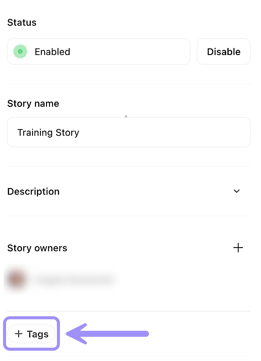 Take advantage of tagging your stories with topics that make sense to your team. These tags can be used to quickly identify stories for reporting. To apply a tag to a story, navigate to the Tags setting in the story's properties panel: