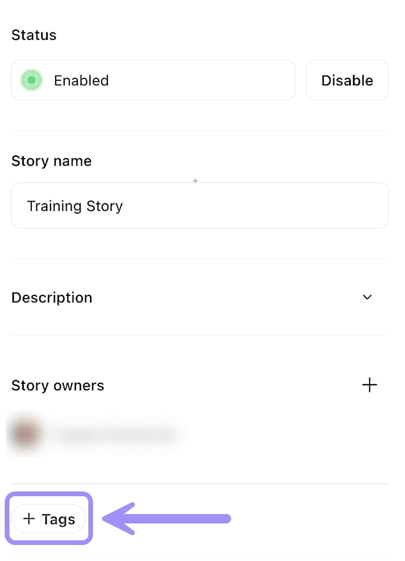 Take advantage of tagging your stories with topics that make sense to your team. These tags can be used to quickly identify stories for reporting. To apply a tag to a story, navigate to the Tags setting in the story's properties panel: