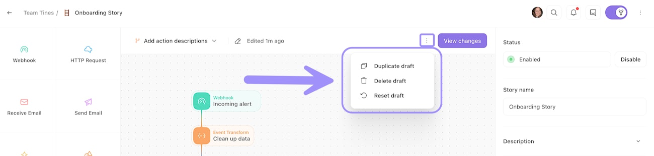 A draft is an editable copy of your live story, a place where you can make changes, experiment with new logic, and test thoroughly without any impact on the production workflow.