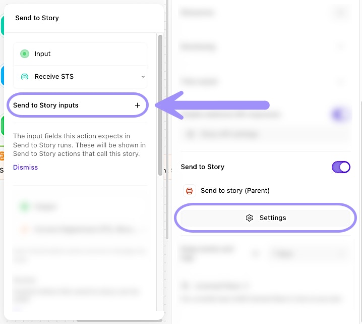 Your sub-story should expect a specific data structure. The best way to do this is by defining inputs in your sub-story settings. When you define inputs for your sub-story, you're creating a clear contract that tells users exactly what data to send. You can define send to story inputs via the sub-story's properties panel → Send to Story → Settings → Send to Story inputs: