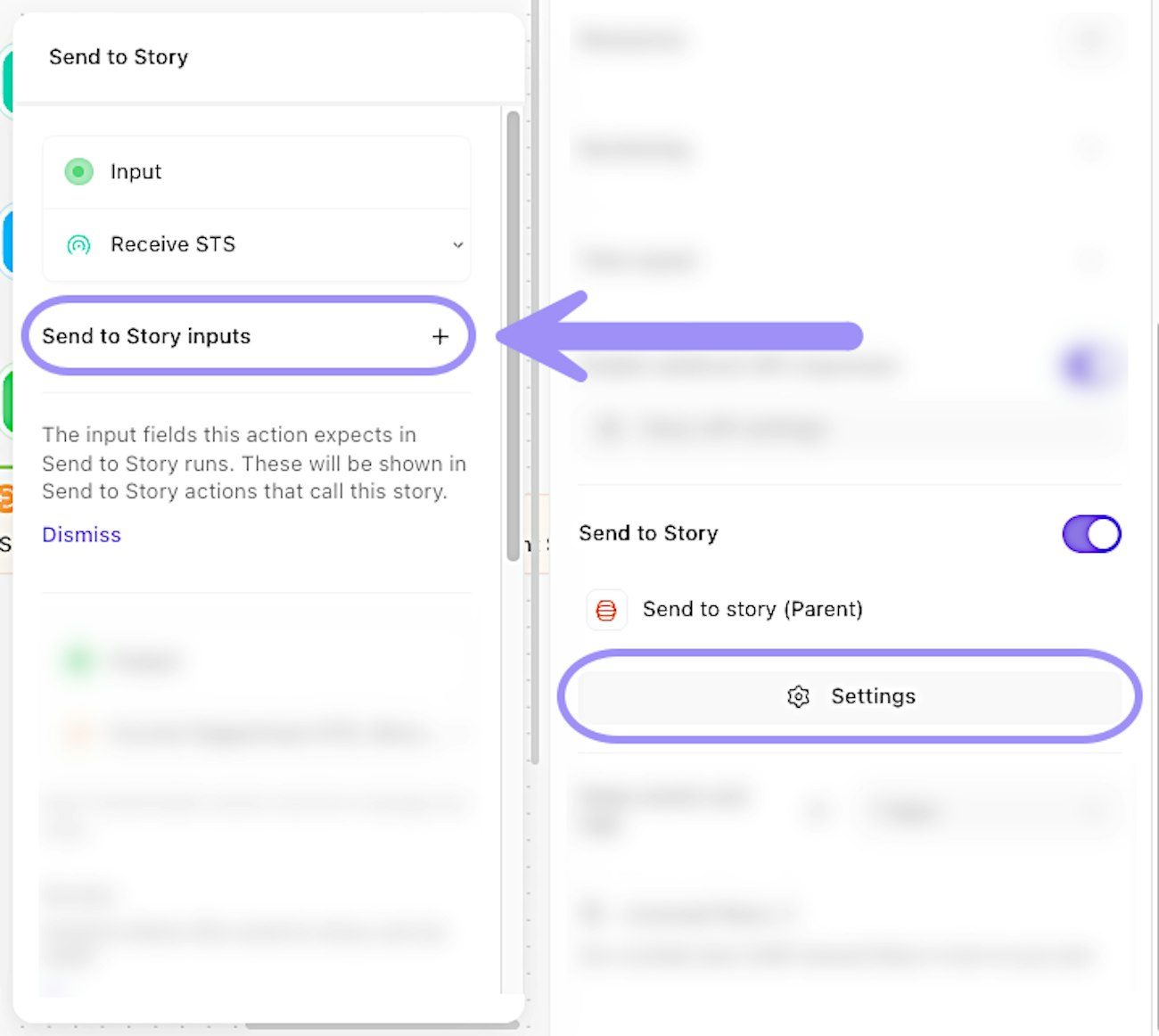 Your sub-story should expect a specific data structure. The best way to do this is by defining inputs in your sub-story settings. When you define inputs for your sub-story, you're creating a clear contract that tells users exactly what data to send. You can define send to story inputs via the sub-story's properties panel → Send to Story → Settings → Send to Story inputs: