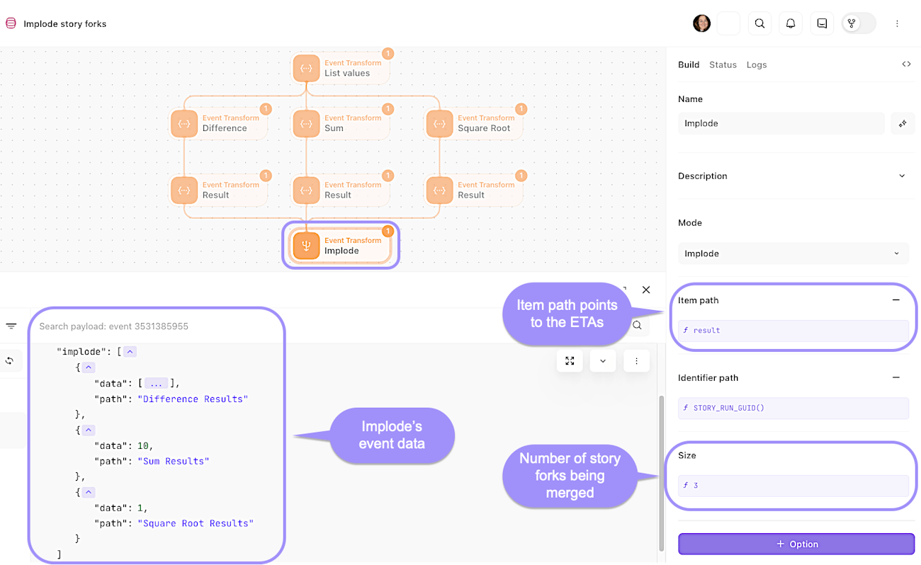 Another way to implode a story fork is by utilizing functions in the implode's Item path to pull together the results from the different forks (this is useful when you don't want to use the duplicate ETA naming method). Similar to the other method, the implode merges the output from each story branch into one unified event: