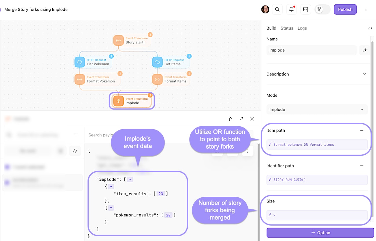 While explode and implode are commonly used together, implode has another valuable application: bringing together parallel branches of your story. This story design, known as a story fork (covered in our Builder: Core learning path), allows you to process data through multiple paths simultaneously and then consolidate the results.