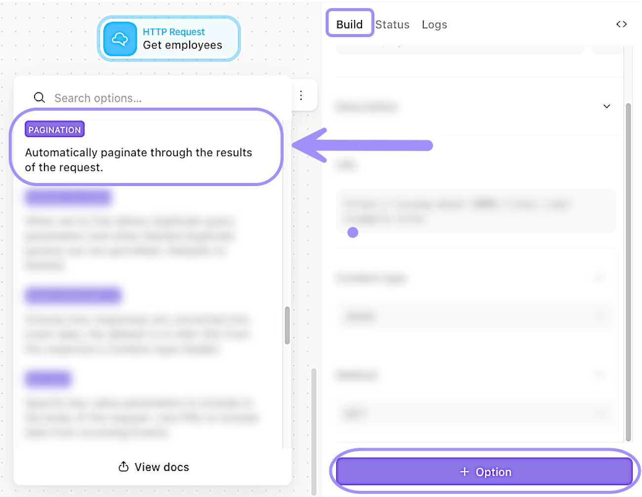 To enable the pagination and start utilizing the PAGINATE key, navigate to your HTTP request action's properties panel → Build tab → + Option → Pagination: