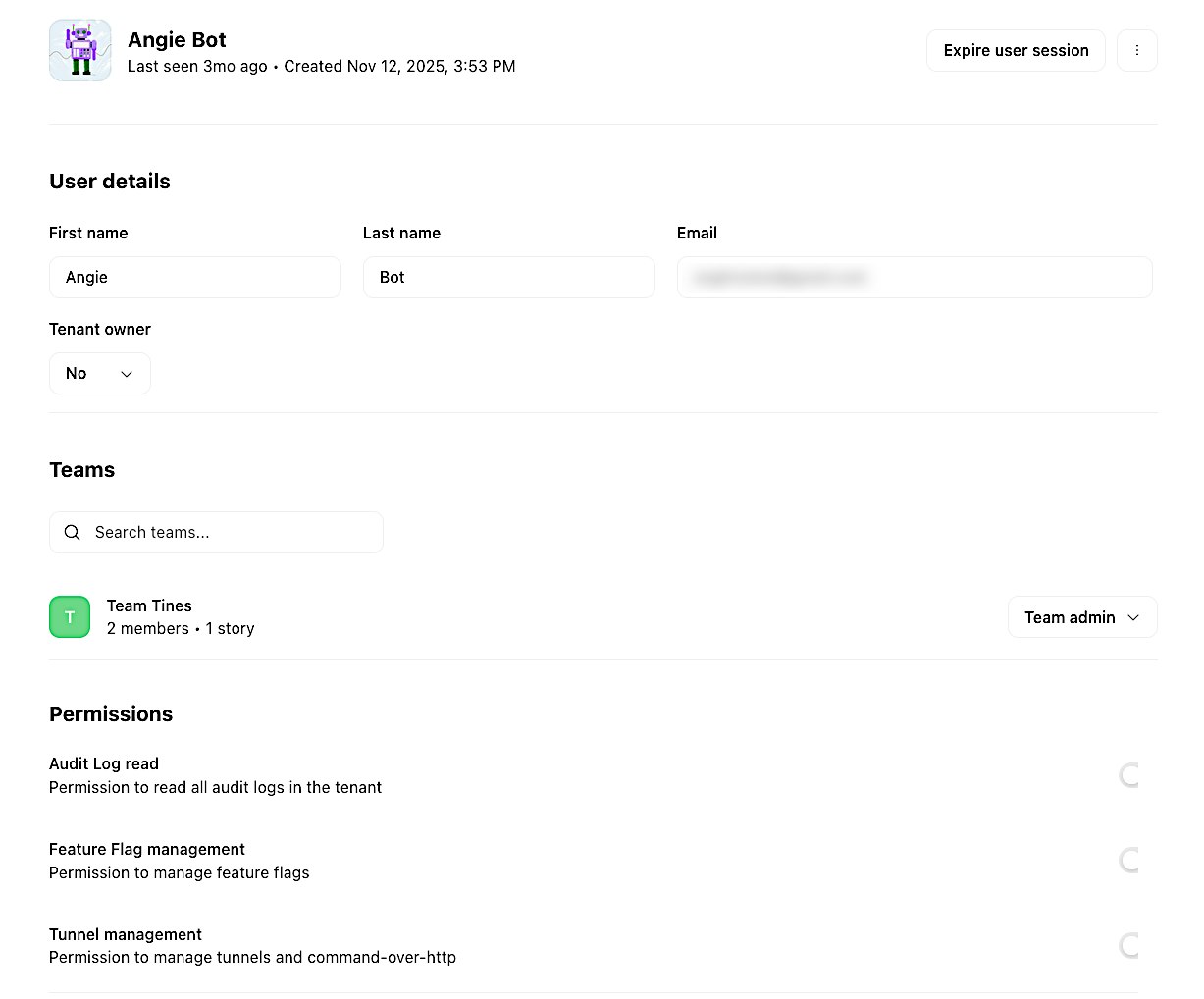 From here, you can view their profile details, including their email, tenant role, team memberships, and last active time.
