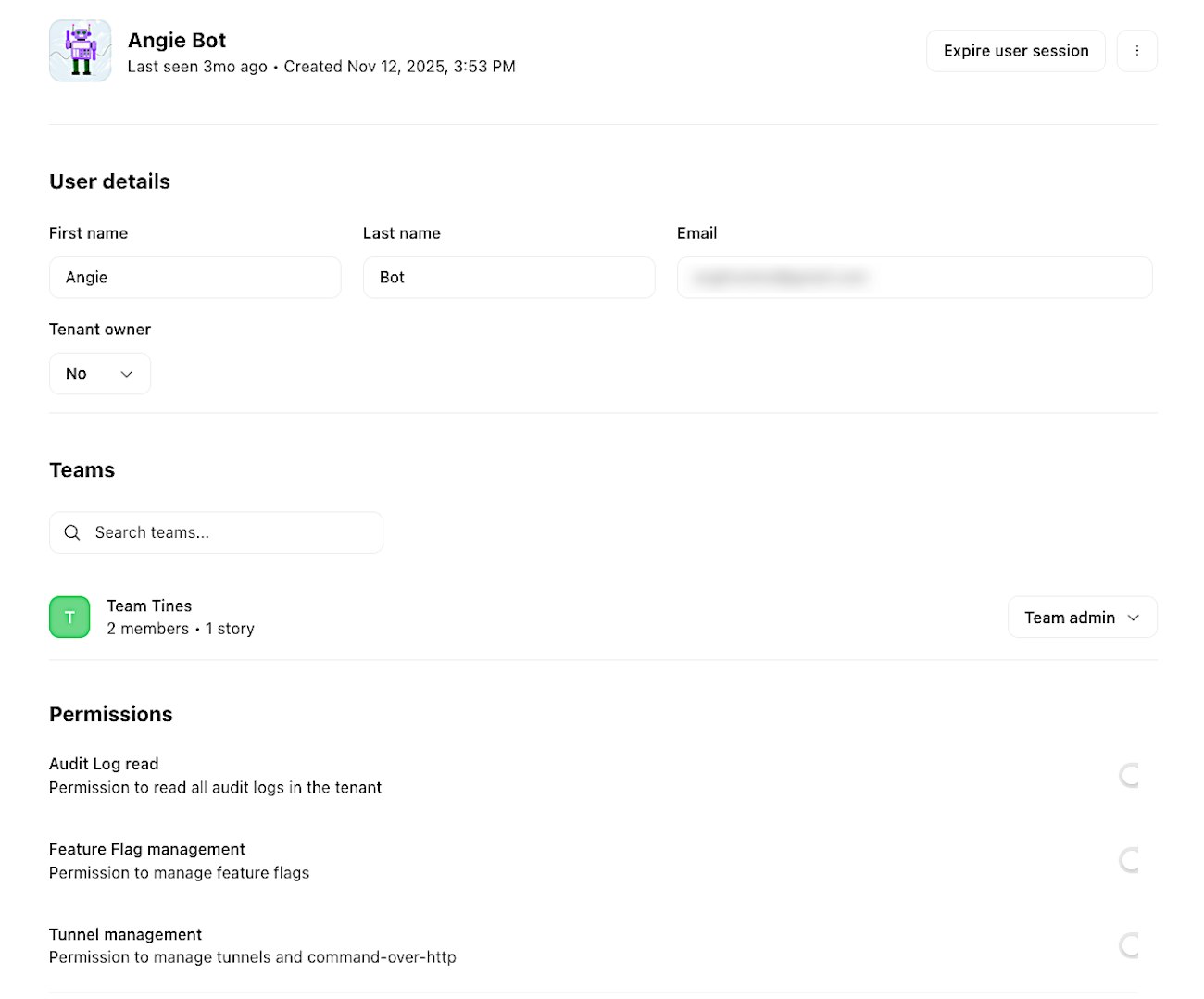 From here, you can view their profile details, including their email, tenant role, team memberships, and last active time.