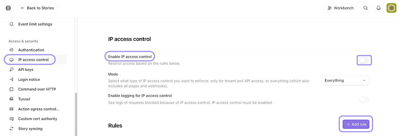 Tenant and API mode: Enforces access control on the tenant UI and API access (any endpoint requiring user authentication). Public pages and webhooks remain accessible from any IP address. This mode is ideal if you want to protect administrative access while keeping your published pages and webhook endpoints available to external users.