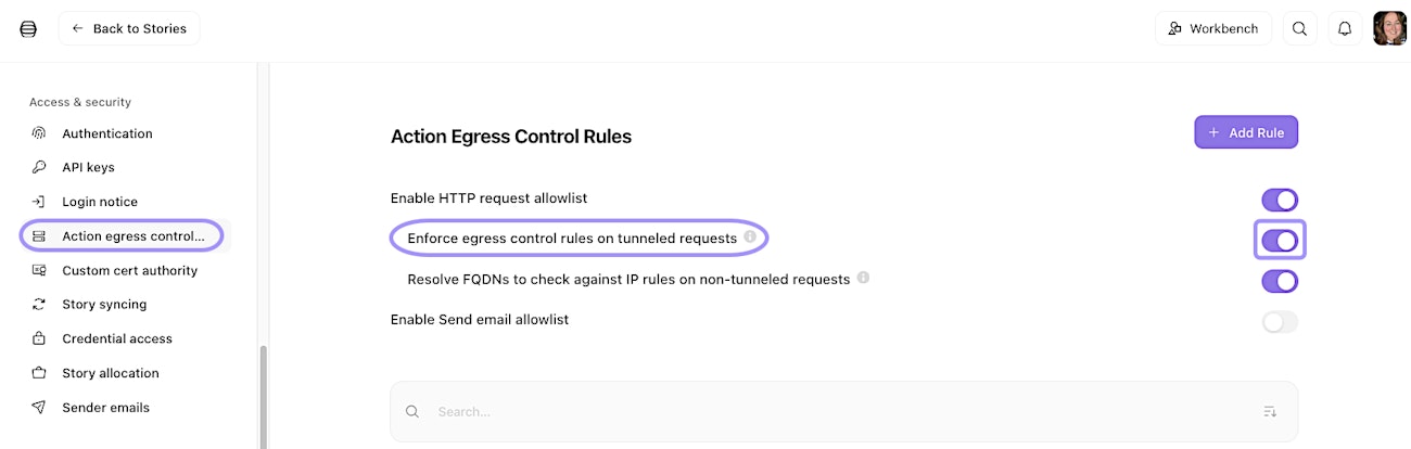 If you're using a tunnel to connect to private networks, you can enable action egress control for tunneled HTTP Request actions. When enabled, FQDNs will not be resolved to IPs for tunneled requests. This means the FQDN must be explicitly on your allowlist, regardless of what IP it resolves to. Toggle on the Enforce egress control rules on tunneled requests setting to activate this feature.
