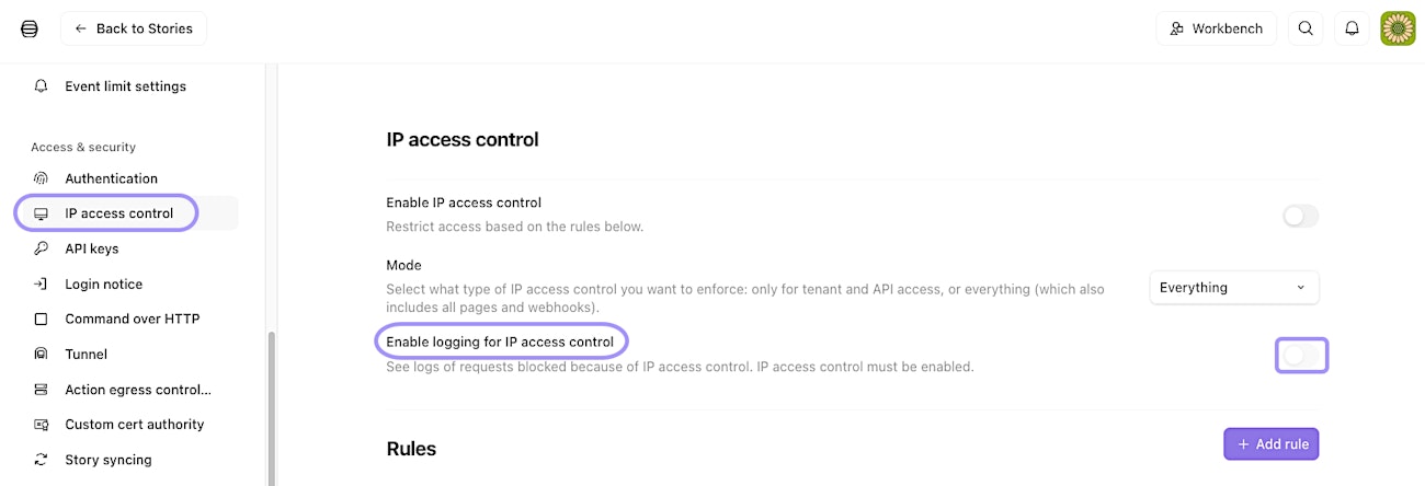 When IP access control is enabled, you can optionally turn on logging to view blocked access requests via the Enable logging for IP access control setting. These logs show the timestamp, IP address, user agent, and URL of each blocked attempt. Logs are retained for 90 days and can be filtered by IP address or user agent.