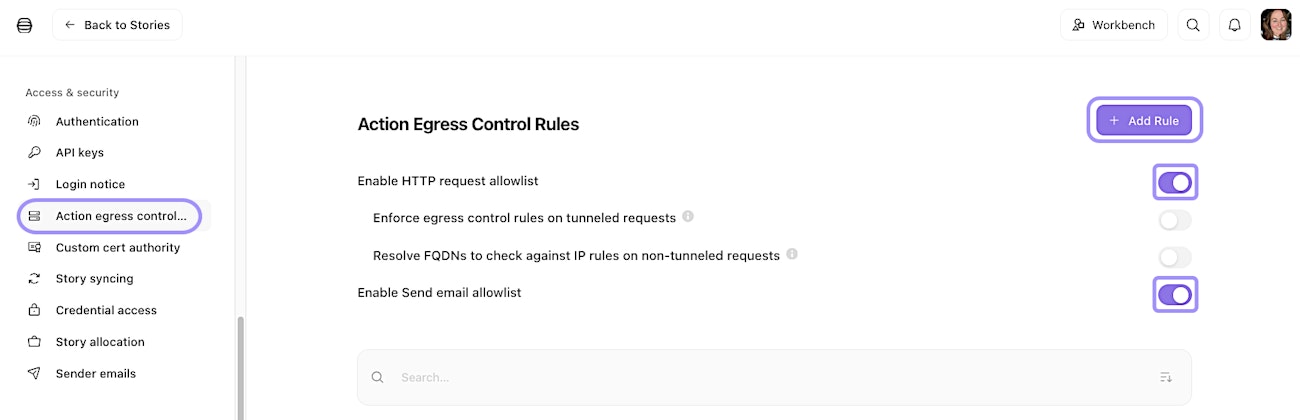 If you're using a tunnel to connect to private networks, you can enable action egress control for tunneled HTTP Request actions. When enabled, FQDNs will not be resolved to IPs for tunneled requests. This means the FQDN must be explicitly on your allowlist, regardless of what IP it resolves to. Toggle on the Enforce egress control rules on tunneled requests setting to activate this feature.