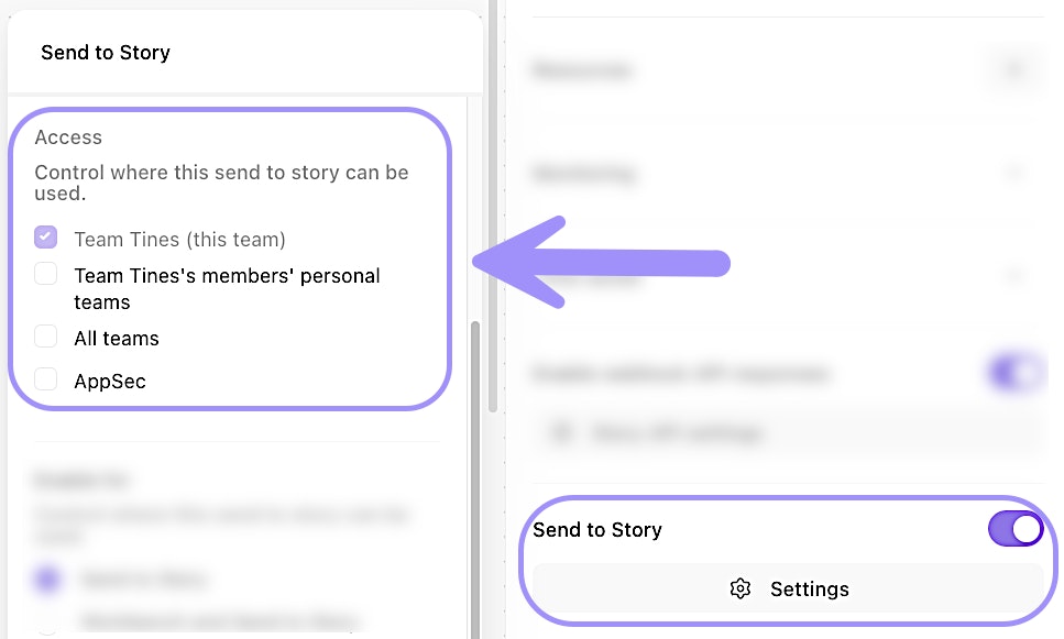 UI location to configure teams' Send to Story access for a story.