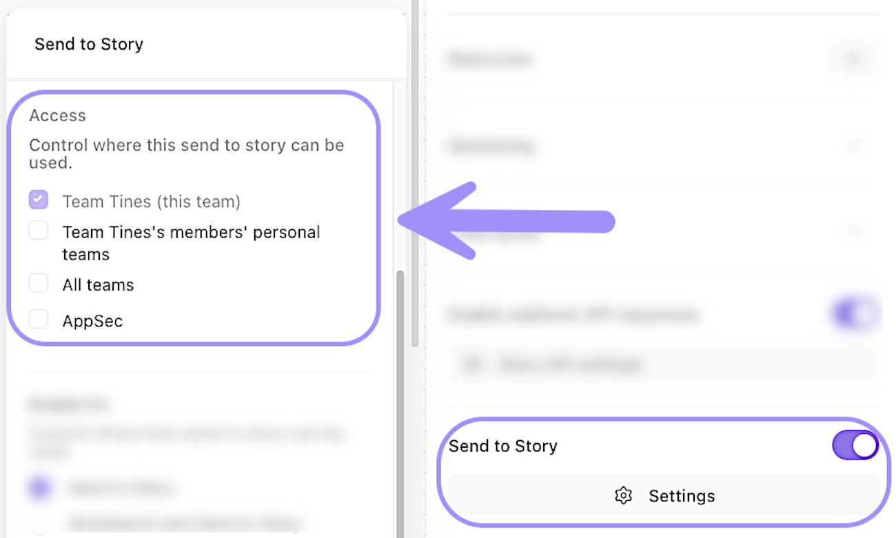 UI location to configure teams' Send to Story access for a story.