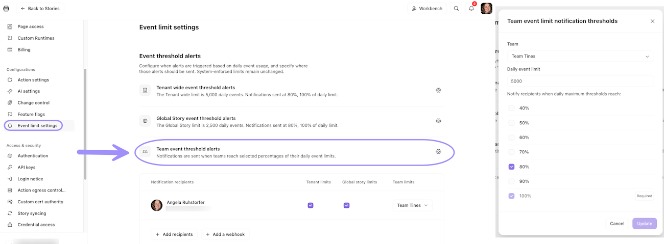 Configure notifications via the Notification recipients section to alert yourself and/or team admins when they're approaching their limit.