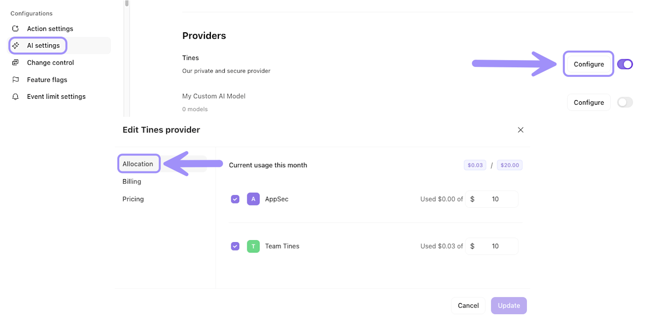 In the Edit Tines provider pop-up window → Allocation tab, distribute your available credits across teams based on their AI usage needs.