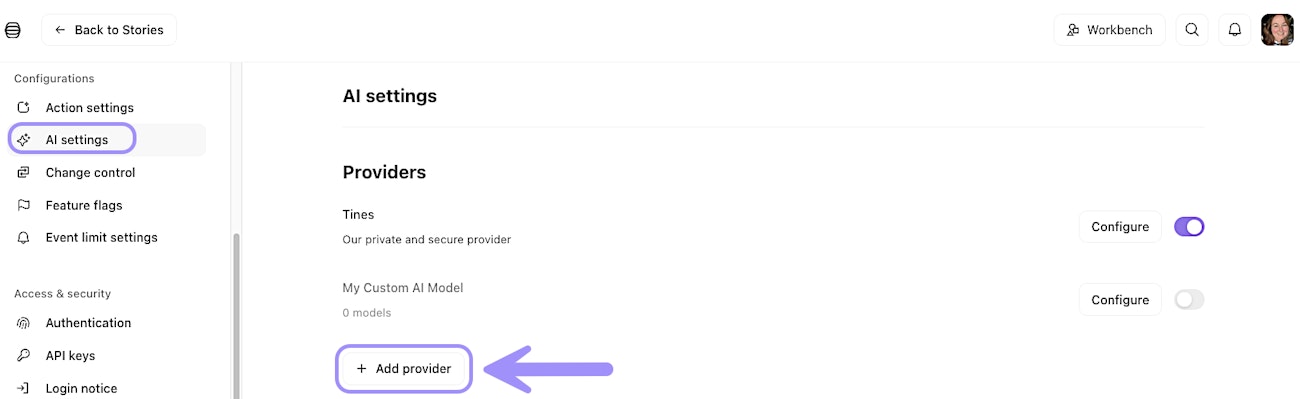 Once AI features are enabled, you can start using them with the default Tines provider immediately. But you can also configure your own AI providers.