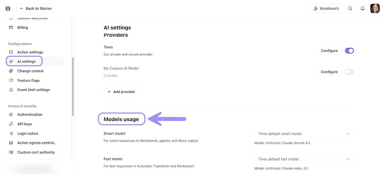 Tines uses two model categories: fast models and smart models. Fast models power features like Automatic mode, where speed is important. Smart models are used for more complex tasks, such as Workbench conversations or AI agent interactions.