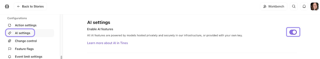 As a tenant owner, you control whether AI features are available across your entire tenant. This includes AI Agent actions in stories and AI-powered features like Workbench. You can turn AI features on or off at any time.