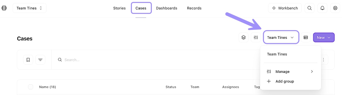 UI location of the case groups feature in the list view.
