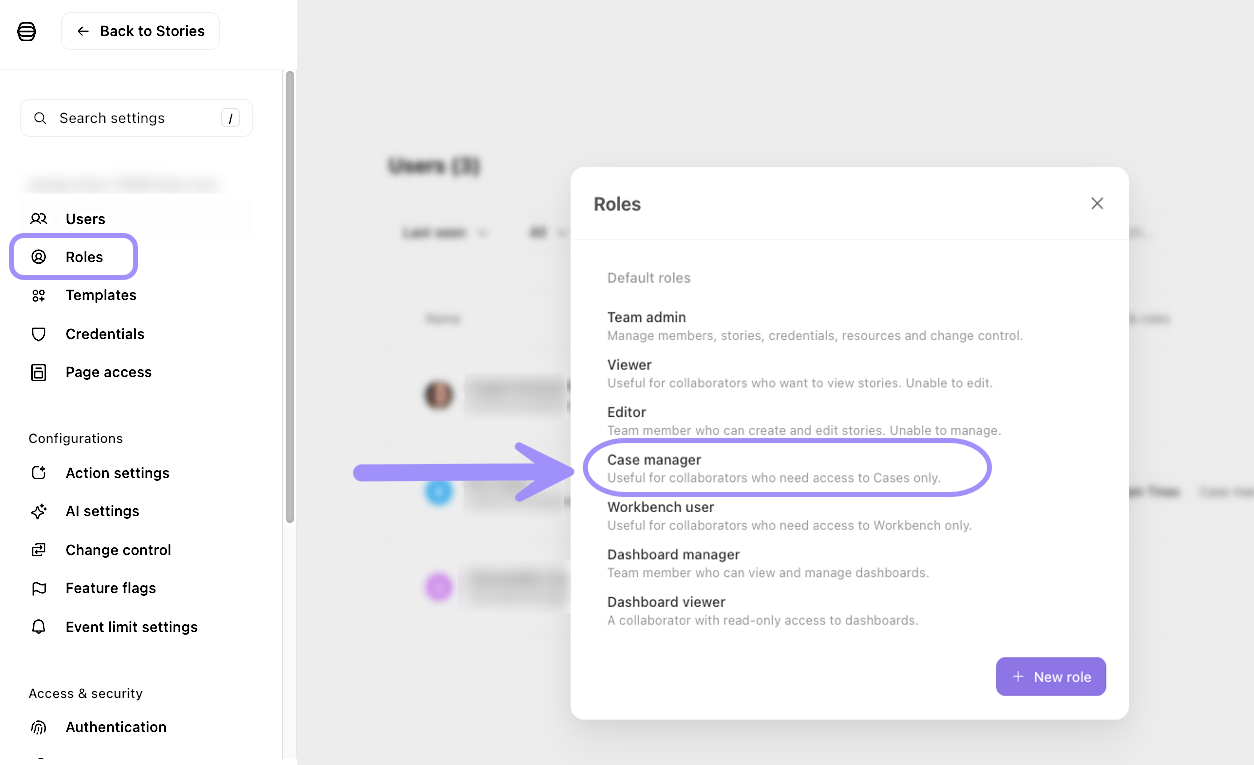 Navigate to the team menu Settings → Roles. Click into any role (like case manager) to see which permissions it grants: