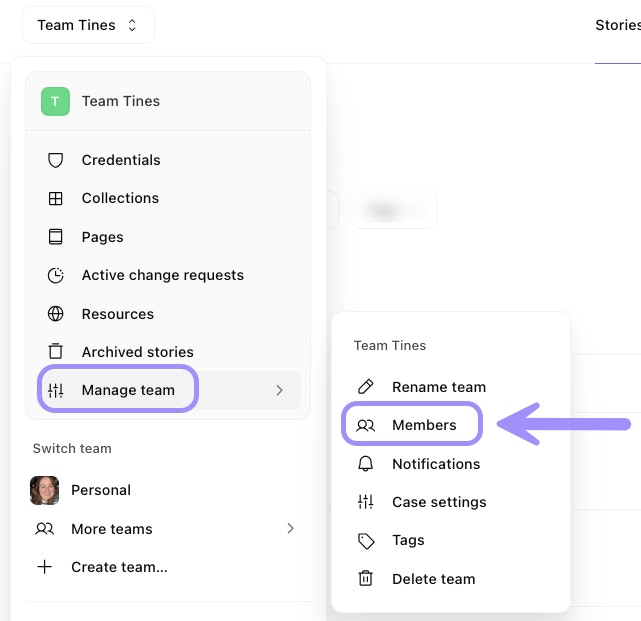 Team-level view: Go to team menu Manage team → Members to see role assignments for a specific team: