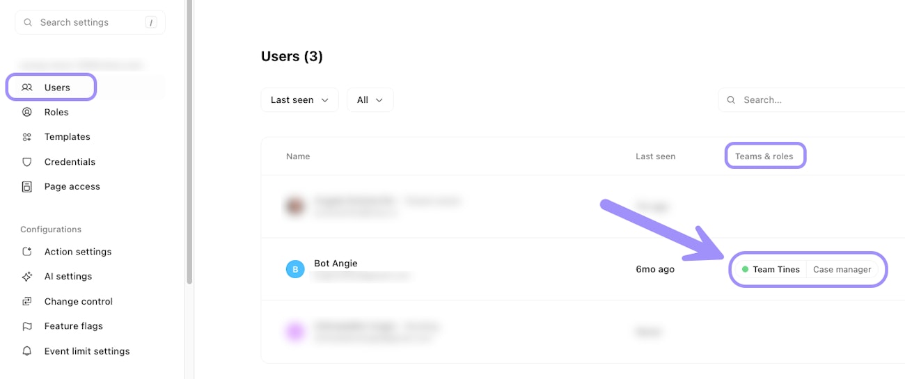 Navigate to the team menu Settings → Roles. Click into any role (like case manager) to see which permissions it grants: