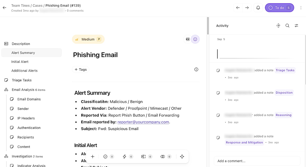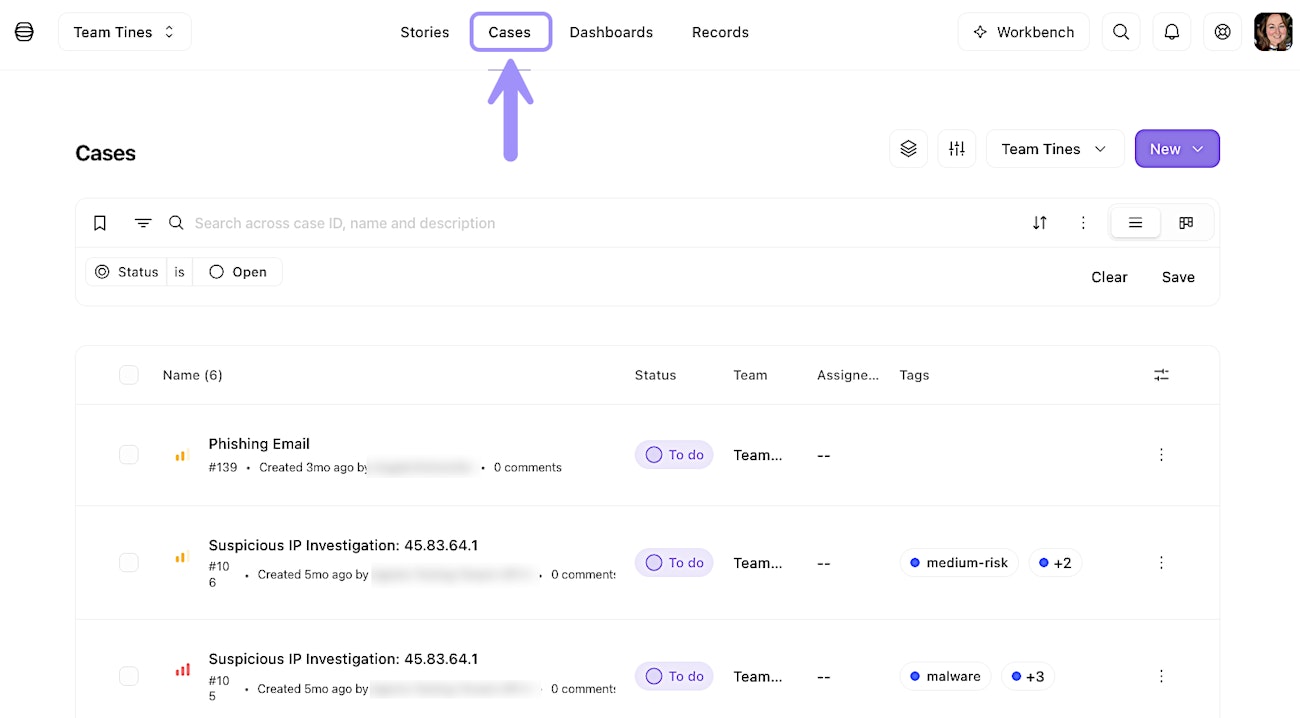 The list view gives you a bird’s-eye view of all cases. Here you can sort, filter, and quickly find what needs attention. You can find the list view via the Cases tab in the top navigation bar of the Tines UI: