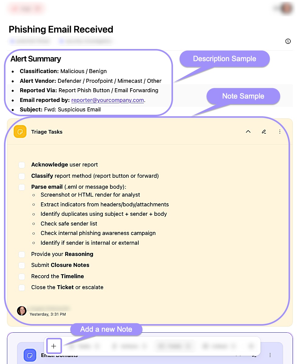 Description: A rich-text field supporting Markdown, allowing detailed documentation of the case's context, history, and actions taken.