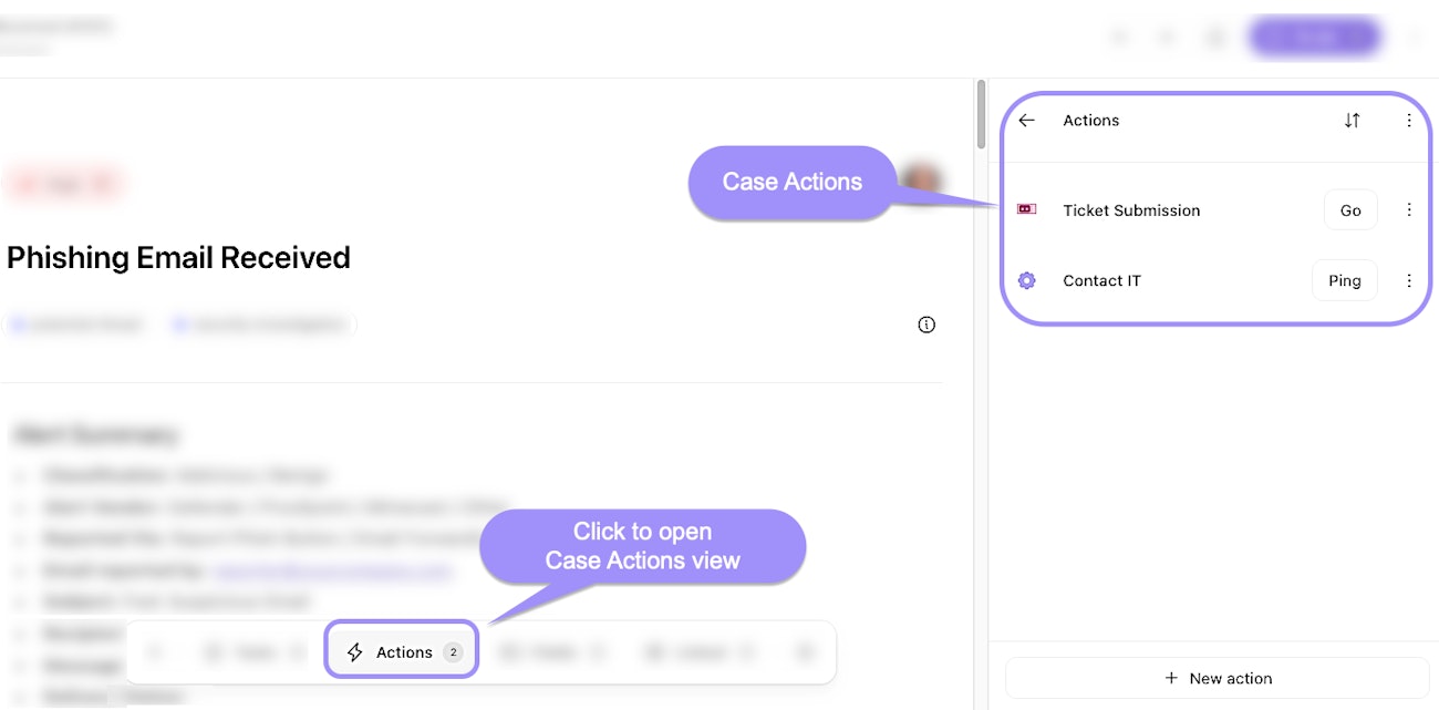 Case actions: Defined tasks or operations that can be triggered within a case, such as sending a webhook or opening a page (these elements exist in a story). These case actions facilitate automation and integration with other systems.