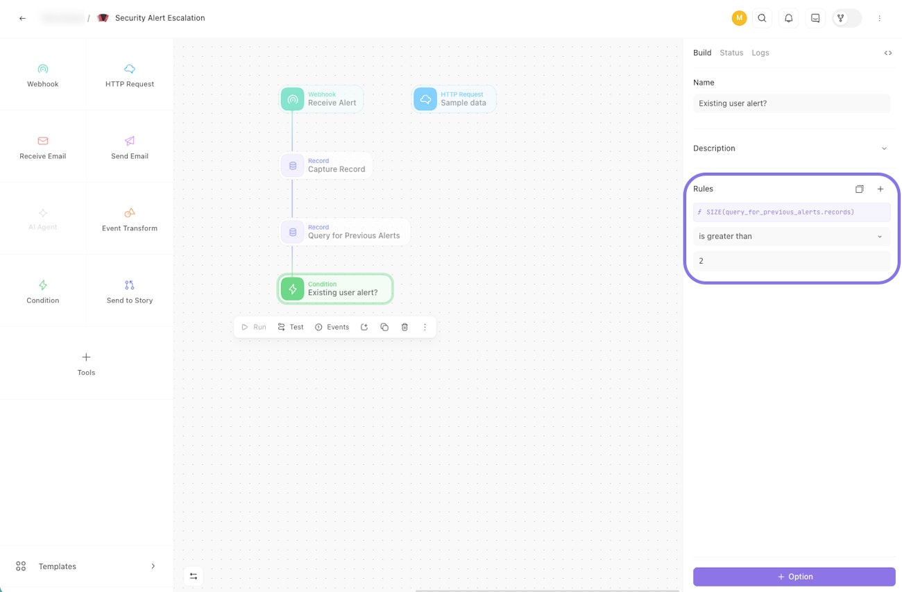 The storyboard with a Condition action connected after the List Record tool. The configuration panel shows a rule that escalates when the query returns more than two previous alerts.