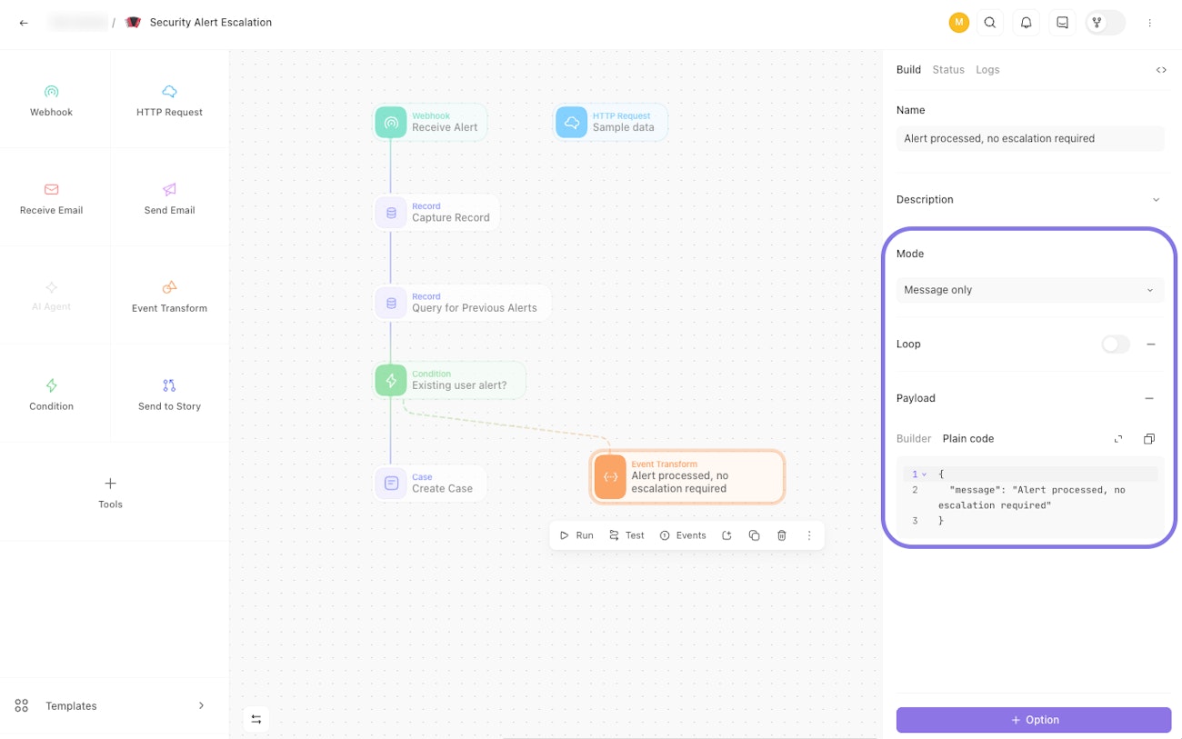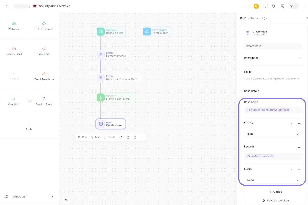 Now let's build a complete workflow that demonstrates everything you've learned. You'll create a story that receives a security alert, captures it as a record, checks for previous alerts from the same user, and escalates to a case if a pattern is detected.