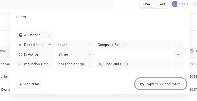 The records table filter menu with the Copy cURL command option highlighted.