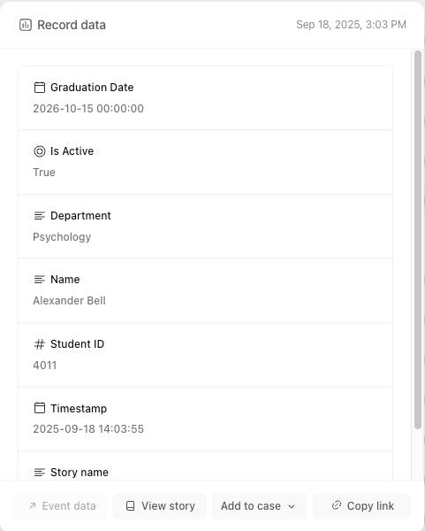 An individual record's detail view showing field values, timestamp, and the story that captured it.