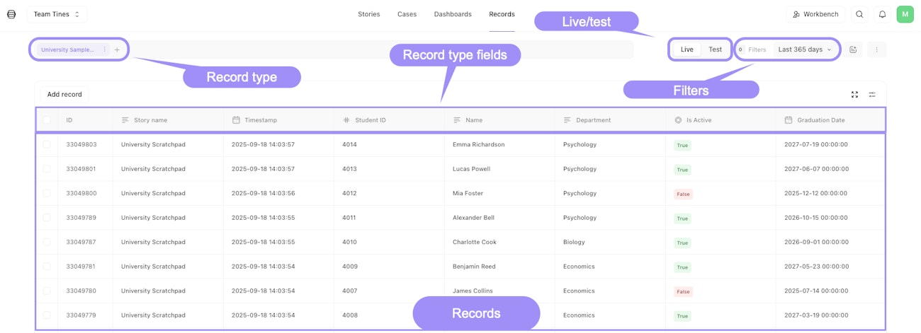 The Records UI is where you view, filter, and analyze structured data captured from your Tines workflows. This is where you'll query, filter, and report on your records data.