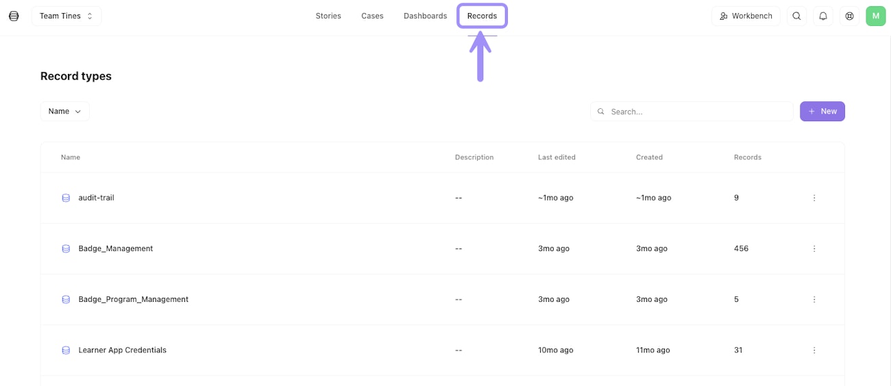 The list view is your starting point when you click the Records tab in the top navigation. It displays all record types available in your team, with each type showing its name, record count, and last edited timestamp.